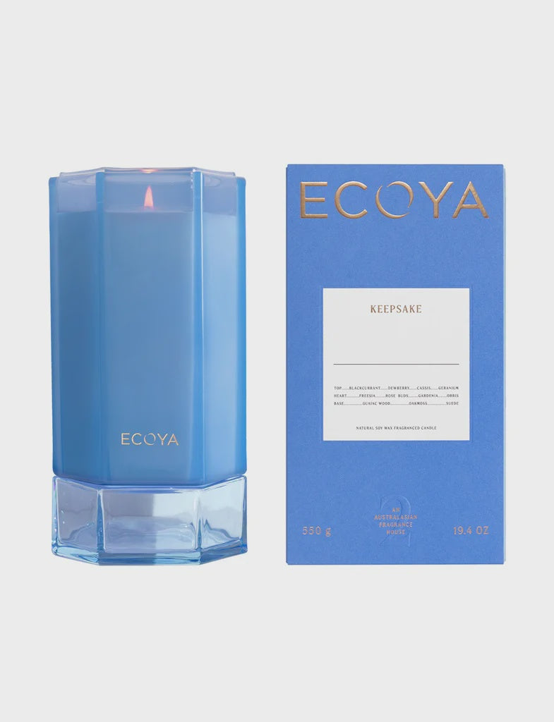 A fragrance to hold onto. Encased in a sculptural six-sided coloured cut glass jar, the Keepsake Candle is designed to be as timeless as the memories it evokes.