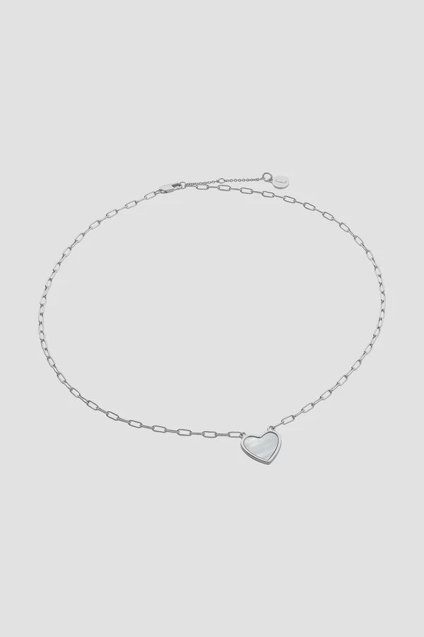 Modern heart necklaceMother of pearl inlayOpen link 48cm chainMicroplated finishNickel freeAn on trend design, this heart necklace will be getting lots of attention this season. We love the Mother of Pearl finish.