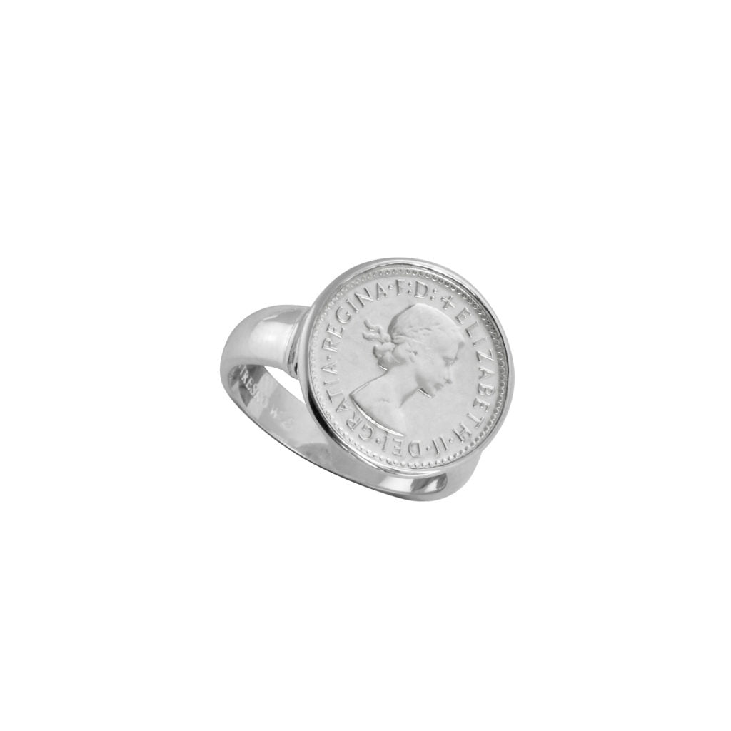 From Von Treskow’s iconic coin collections, the authentic Australian threepence coin ring. This piece includes a real Australian threepence coin encased within sterling silver and set into its band.