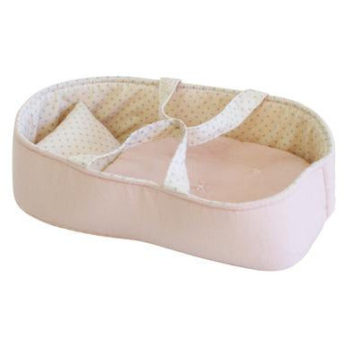 A sweet reversible fabric nesting basket with a mini quilt and pillow. Perfect for our asleep/awake baby doll. Approx 30cm long. Suitable 3yrs.