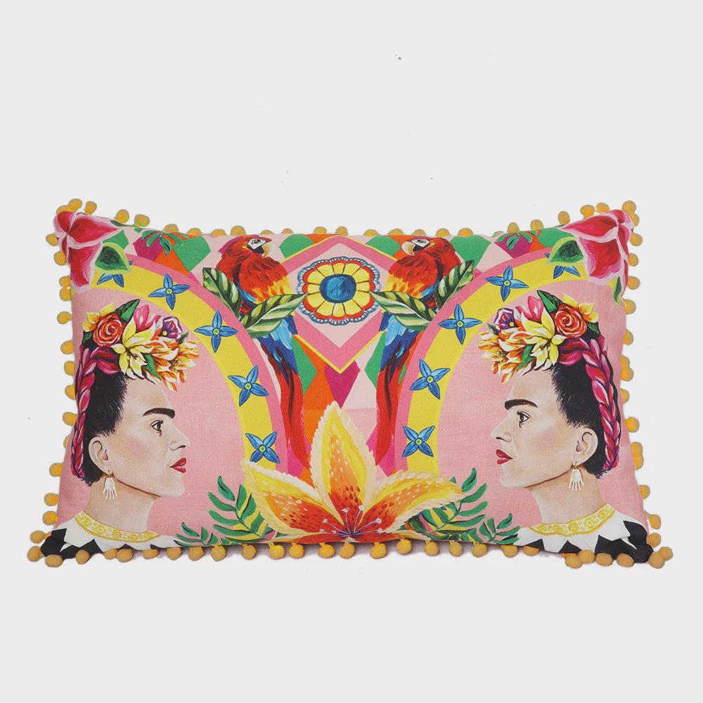 Introducing Viva La Vida, the perfect rectangle cushion for Frida fans, design maximalists, and lovers of colourful interiors. This double-sided cushion is digitally printed on high-quality cotton, complete with a yellow bobble trim. The front side features a painted mirrored portrait of Frida Kahlo, while the reverse side showcases vibrant Mexican-inspired patterns.