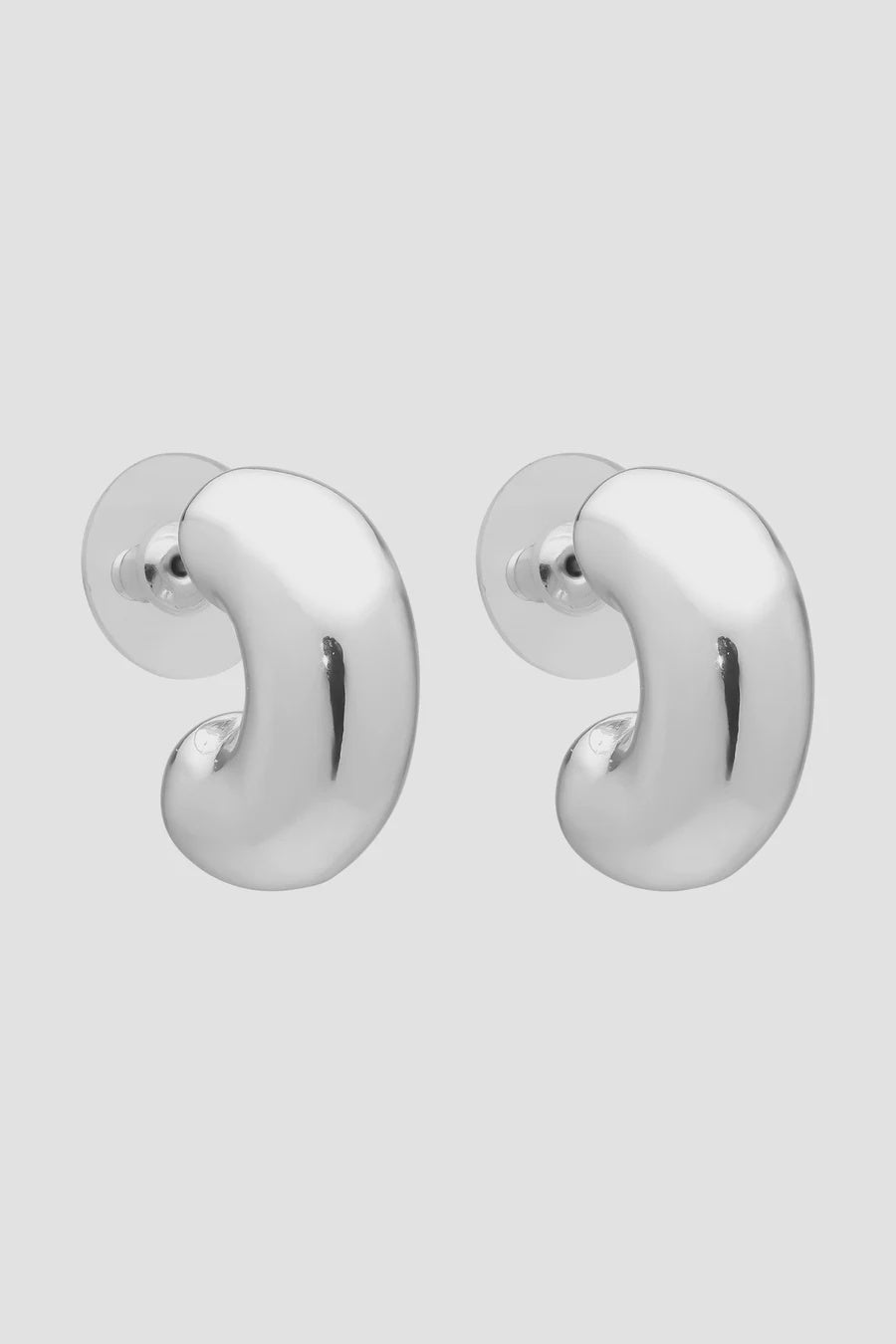 Gael chunky half hoop designMicroplated silver finishStainless steel posts for sensitive earsComes with logo box & pouchThe perfect minimal style with chunky proportions. Solid in form and timeless in design. Available in Silver or gold.
