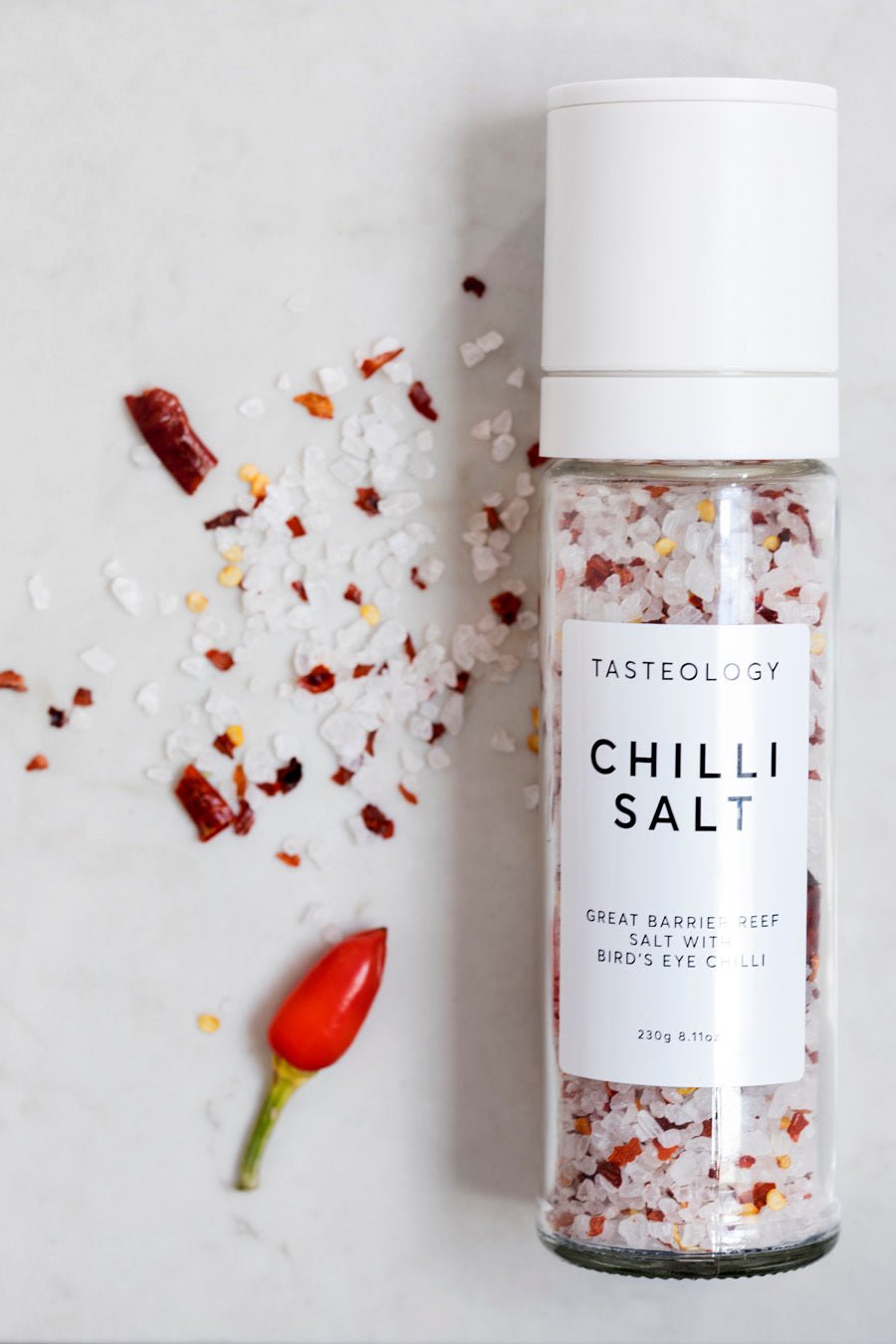 Our TASTEOLOGY Chili Salt has a base of Great Barrier Reef white rock salt, which has been carefully mixed in with birds eye dried chilli flakes to create a hot chili salt for the true Chili lover.