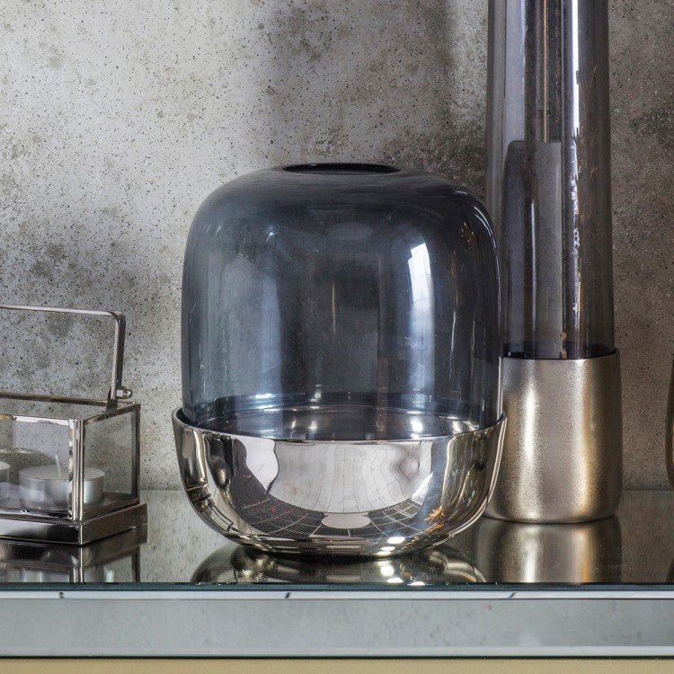 Stylish hurricane lamp made from grey tinted glass with a polished nickel plated base.