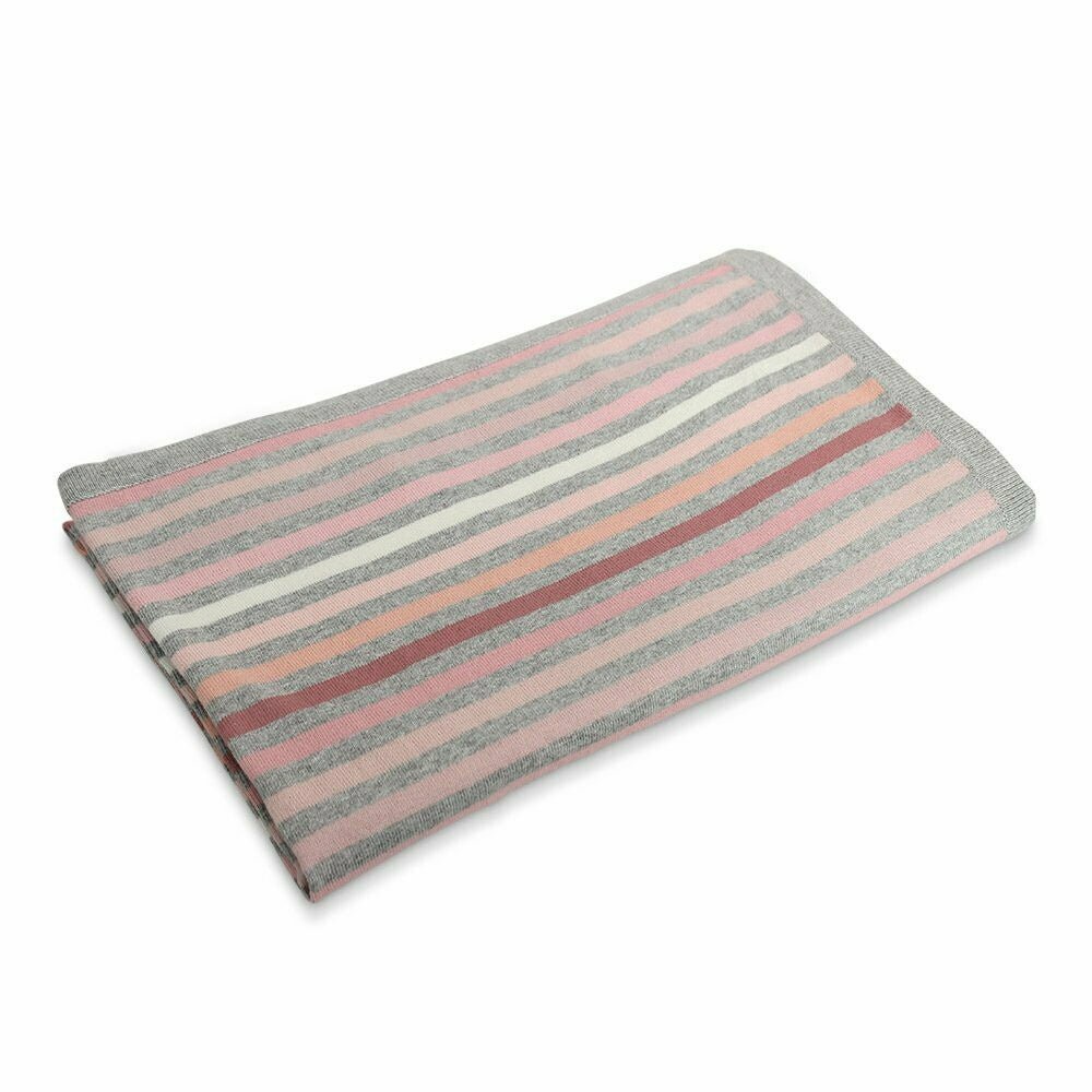 Multi coloured knitted stripe baby blanket - features a rib edging and is knitted from premium cotton yarns.