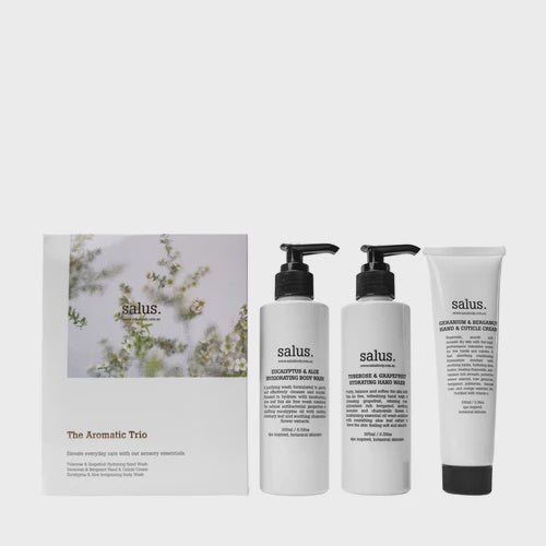 A moment of pause and reset. Indulge in a sensory ritual designed by Salus to ground and uplift. This carefully curated hand and body care trio offers a transportive edit for daily moments of calm and clarity. Crafted in Melbourne, Australia, this trio is perfect for gifting or adding to your own self-care routine. The set includes: