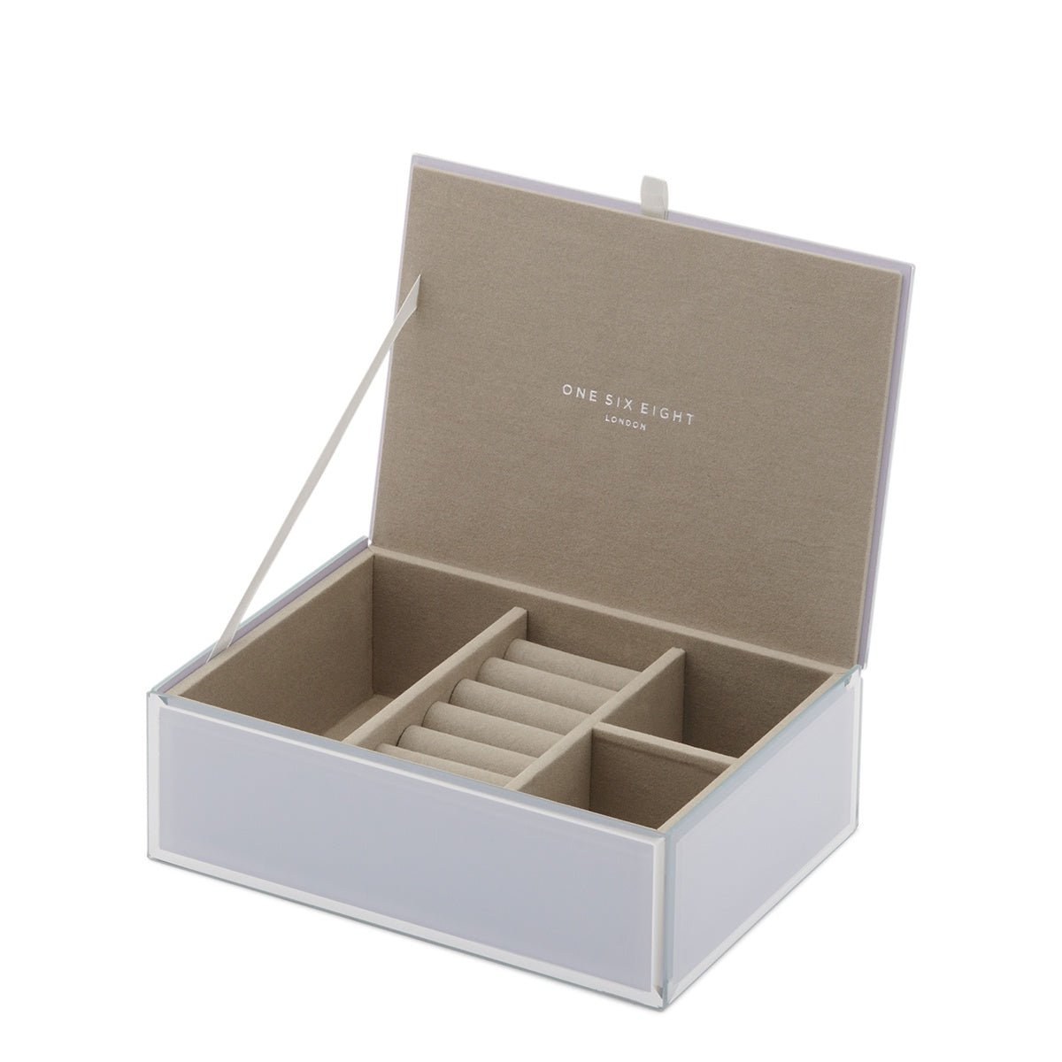 Stash trinkets and treasures galore in this luxurious-looking jewellery box. It's like a jewel itself, crafted from gleaming glass with Art-Deco-inspired bevelled edges and shimmering contrast trim. The classic shape will fit neatly on your vanity table and bring a touch of vintage glamour to your room. Lift the lid to reveal your prettiest possessions resting on a sumptuous black velvet lining. Choosing your accessories has never been such a delight.