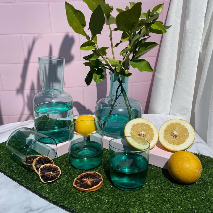 Made with solid mouth blown glass (slight imperfections may appear as each one is unique), our new Water Carafe and Tumbler Set is the perfect addition to spice up your home or office decor. On trend colours are sure to tie in with any home interior colour schemes. Carafe holds 800 mls.
